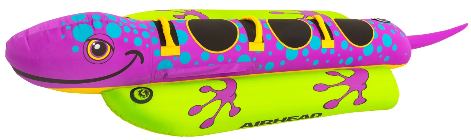 Sneak and slide along the water’s surface in our Salamander towable tube. This bright and vibrant 3 person inflatable boat tube has room for three young riders or one adult and two children. The comfortable EVA foam padding makes the ride smooth and the Patented Speed Safety Valve will inflate and deflate your tube fast.