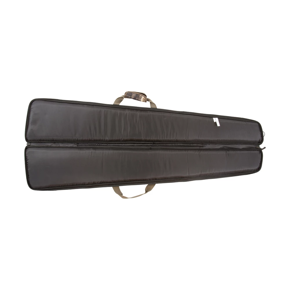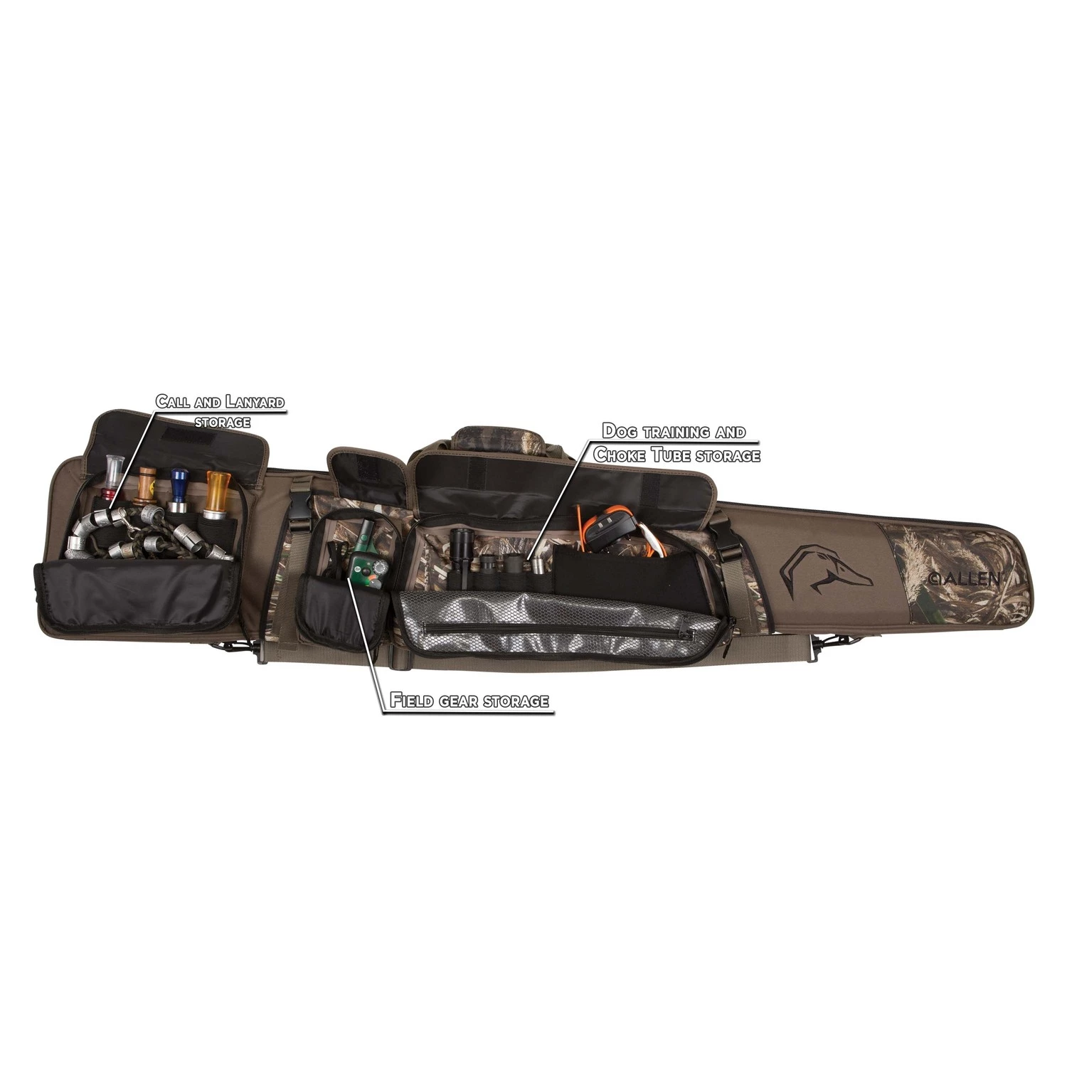 Waterfowl season awaits with the Gear Fit Pursuit™ Punisher™ Shotgun Case. Purpose-driven and designed so you can bring all your Waterfowl hunting essentials with you, from calls and choke tubes, to dog training gear and more. Made with Realtree® MAX-5™ camo, the case fits shotguns up to 52-inches and features two gear storage flaps and three zippered pockets designed for what you bring to the hunt. The main front pocket has a weatherproof storage pocket, four large elastic loops, and a stretch-fit pocket for storing larger items. The center pocket was designed to hold field gear, such as your rangefinder and compass. The rear pocket is designed to hold 4 calls and your lanyard. This case also features the innovative Gear Fit™ quick-connect straps, which allow you to bring large items, like your jacket or dog vest. The inside of the case has heavy-duty, dual-density foam for ultimate protection. The lining is easy to clean, and the oversized zippers make it easy to open and close. includes a detachable, adjustable shoulder strap. The Gear Fit Pursuit™ Punisher™ Shotgun Case is highly water-resistant and can float for a limited time with a firearm and appropriate amount of gear stored properly in the case. This case is not to be used as a flotation device please exercise caution and safety when hunting near water.