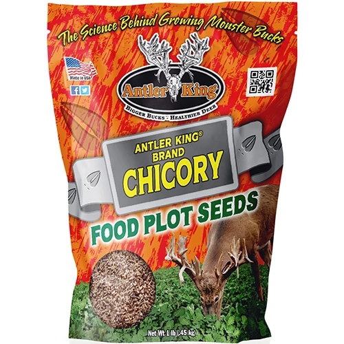 Looking for something different to spice up your Fall Food Plot Program? Antler King® Brand Chicory is just the answer! This special variety of chicory is a hardy, cool-season perennial that offers great nutrition and a highly preferred food source for your whitetail deer. Chicory can adapt to a variety of soil conditions, is pH tolerant, drought tolerant grows fast and does a great job of crowding out weeds in your food plot. Chicory can be planted as a stand-alone crop or mixed with cereal grains or clover and with enough moisture will continue to come back for several years. Once established, Chicory offers a great perennial food source and its leafy forage can provide 15-30% protein to help promote body and antler growth as well as being a great source of many key minerals Chicory can be planted in the Spring or in August/September in the Northern States and September/October in the Southern States. Chicory will perform best with a pH of 6.0-7.0 and planted in full sun or mostly sunny areas. Adding this hardy perennial food plot mix to your current food plot program will help provide your deer herd an established, relied upon year-round food source and allow your property to hold and feed more deer.