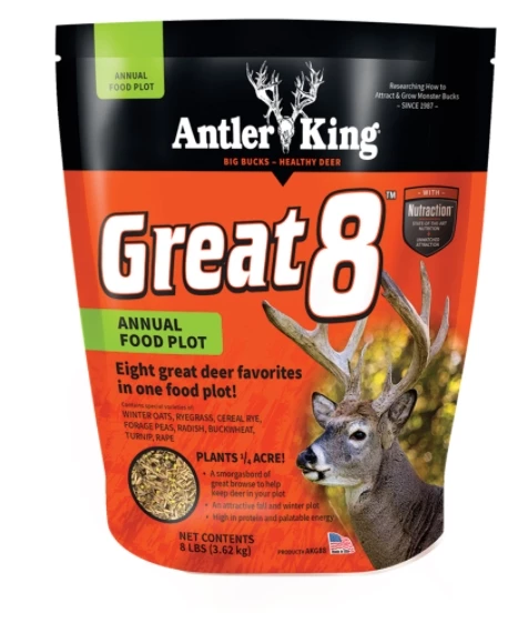Antler King®’s GREAT 8™ is a fall annual food plot blend that consists of eight specially selected plant varieties. These varieties help ensure there are always plants maturing and available to graze on. If you are not certain what to plant and want to make sure your food plot always has something for deer to eat, plant GREAT 8.