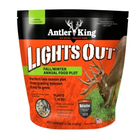 NUTRITION: The leafy greens and fibrous roots of the Brassicas in Lights Out provide 16-25% protein, 4% gross energy (equivalent to corn) and are easily digestible and palatable offering deer a high energy alternative to corn that is much easier to digest and much cheaper to plant and maintain. The first killing frost or consecutive frosts will help trigger maturity and a dramatic molecular change that will allow the Brassica plants to convert their stored up starches to sugars creating an irresistible sugary food plot that deer will crave throughout the colder months. This highly sought after combination of grains and brassicas is designed for the deer hunter and land manager and will provide your deer herd the food they need, when they need it most!