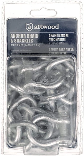 This Attwood Anchor Chain is intended for use on penetrating anchors and it holds down anchor shanks to help keep the anchor flat. This Anchor Chain increases anchor holding strength, especially in strong currents, high winds, and in coastal waters. It protects the line from chafing on sharp rocks, and it has a welded, oversized link on each end for easy installation and anchor attachment. This hot dip galvanized steel chain has 2 shackles and is ¼-inch x 4 feet long. Attwood Corporation has been an award-winning leader in engineering, testing, and manufacturing the highest quality marine products for over 100 years. We deliver safe and reliable lighting, fuel systems, water systems, seating & pedestals, swim ladders, custom upholstery, and general marine accessories that are easy to install and meet regulatory compliance.