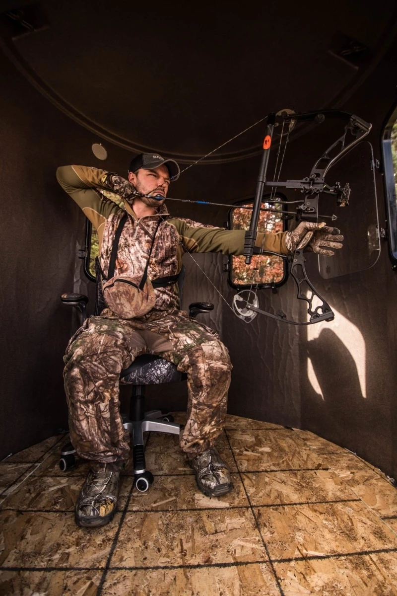 The Stump 3 has been given a 3-point door latching system, as well as the addition of a new foam Floor Mat in every blind. This deer hunting tower blind is equipped with the same vertical window design and same door system as our Stump 4. Enjoy 360-degree views and more room in this versatile elevated hunting blind. Camo curtains & wood legs not included.
