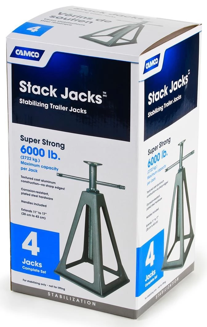 Use Camco 3-Ton Stack Jacks (4-Pack) to safely and evenly raise an RV up to 17 in. off the ground. Each cast aluminum jack supports up to 3-tons of weight. Height is adjustable up to 17”