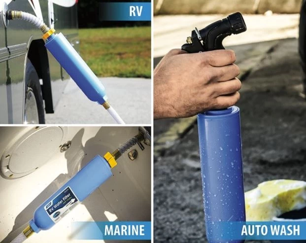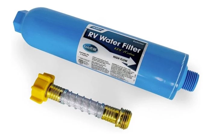 TastePURE™ KDF 2.5 GPM Blue Water Filter with 4″ Hose (40043) by Camco®. Camco TastePURE KDF RV Water Filter is a larger capacity RV water filter that lasts an entire season. Greatly reduces bad taste, odors, chlorine and sediment in drinking water with a 20 micron sediment filter.Safe water matters: GAC (Granular Activated Carbon) filtration greatly reduces bad taste, odor, chlorine, and sedimentLarge capacity filtration: Large capacity in line water filter lasts an average of 3 monthsMultiple uses: Can be attached to any standard gardening or water hose to provide healthier drinking water and cleaner water overall. Great for RVs, boats, campers, pets, gardening, and much more20 micron sediment filter: Removes particles greater than 20 micronsProtects against bacteria: Premium KDF provides protection against bacteria growth while filter is stored or not in useIncludes: Flexible hose protector to reduce strain on connections while minimizing kinkingLow lead certified: Compliant with all federal and state level low lead laws.