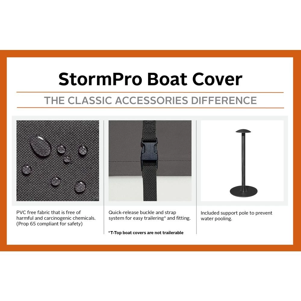 The StormPro™ Trailerable Boat Cover by Classic Accessories provides a heavy-duty cover designed for both long-term storage and highway travel. When you buy a Classic Accessories boat cover you are not just getting a cover; you’re also purchasing peace of mind. Not only will your boat be protected from the elements, but you’ll be protected with the easiest warranty in the industry. If your product fails within the warranty period, look for us online and take advantage of our Hassle-Free warranty program supported by our US-based customer service team.