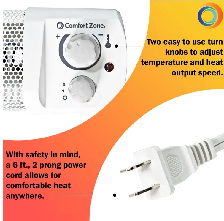 Always rely on comfort zone-America’s heating and cooling choice. This baseboard heater gives immediate and safe heat. Operates at two settings: 750 or 1500-watt. The adjustable thermostat provides automatic temperature control and energy savings. Constructed with a solid, die-cast heating element for silent-even heating. The contemporary design will blend into any home environment. The stay cool body, high impact end panels and mesh grill cover ensure many years of durable and safe operation. Noiseless operation. Also includes rotary dials, a power indicator light and a caution indicator light. A safety tip-over cut-off switch provides the added comfort of safety.