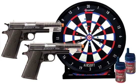 The Stinger Challenge Kit comes with two P311 repeater pistols that hold up to 12 BBs each and shoot at velocities of up to 275 fps. The Airsoft Gel-Trap Target features rings for scoring and the tray at the base catches BBs for easy clean up. Two packages of 500 count .12g airsoft BBs are included, in two different colors, allowing players to monitor their shots.