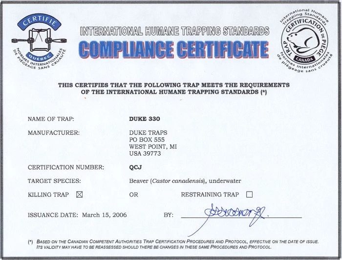 Duke Body Gripping Traps are rotating jaw traps used to quickly catch and dispatch wild animals. This style of trap was developed during the 1950’s and has steadily increased in use due to the versatility and effectiveness of the trap design. Duke Body Traps such as sizes #330 and #280 are widely accepted by state and federal wildlife agencies as the most effective humane traps for beaver population control.