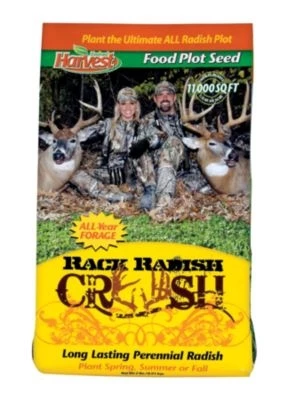 Combining the attractant power of Daikon radishes with the nutrition of T-Raptor rape and the turnip hybrid plant, Rack Radish Crush brings in the deer and keeps them coming back for more. Radishes are known for their attractant power and the sweet and hearty T-Raptor delivers high levels of protein that will help nourish deer through the entire season. This 2-lb. bag covers 1/4 acre.