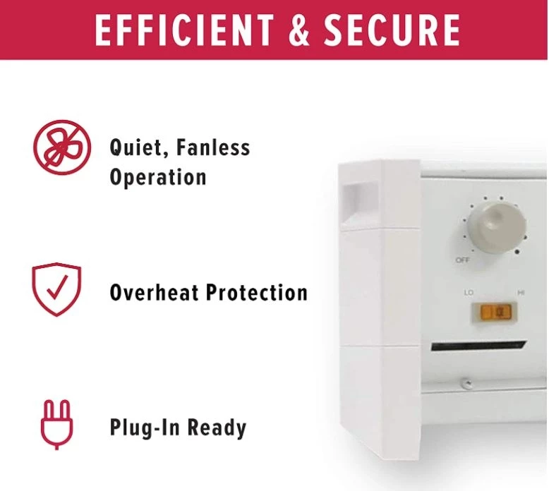 - Fanless Operation: Natural convection moves the heat throughout the room, which means evenly distributed heat with no loud fans or clicking noises