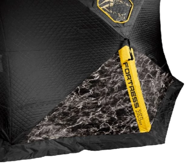 Massive, durable, and dependable: this is truly a beast of an ice shelter. With a gargantuan 100 fishable square feet, the revolutionary Fortress XL creates a luxurious ice fishing environment inside a fully insulated, ultra-stable frame that locks in warmth. Kick-Out Hub Technology provides ample gear storage space in the corner kick-out compartments. This removes clunky gear from around the fishing hole while creating 50% more fishable space. The kick-out hubs also offer the added benefit of increased wind resistance for stability and reduced noise. Gloved hands will love the enhanced T-style zipper pulls, overengineered for ease of use.
