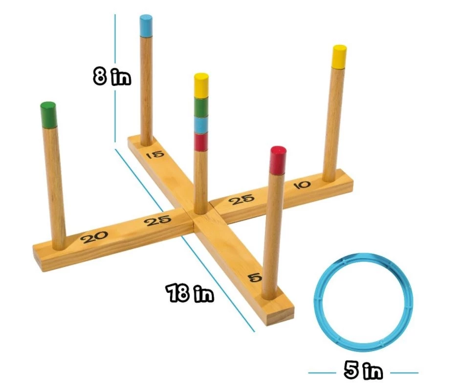 - RING TOSS TARGET has (2) solid wood 18in base pieces and (5) 8in wooden poles. Assembly is quick and tool free.