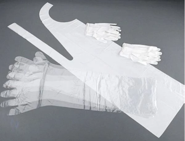 Kit comes with shoulder length gloves, plastic bag, wrist length gloves, and plastic apron.