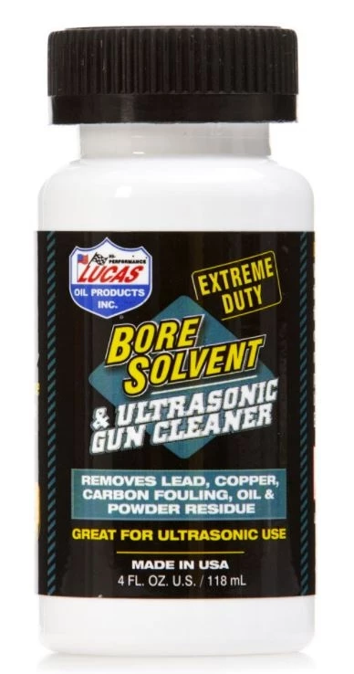 Used and recommended by major firearms manufacturers, Lucas Extreme Duty Bore Solvent & Ultrasonic Gun Cleaner is a premium blend of cleaning solvents and corrosion inhibitors. It easily removes carbon and powder residue from actions as well as copper and lead fouling from cylinders and barrels. The solvent based formula cleans deep to remove old oils and grease and provides a micro thin layer of rust and corrosion inhibitor on metal surfaces and bores. It is safe on polymers and factory applied firearm finishes.