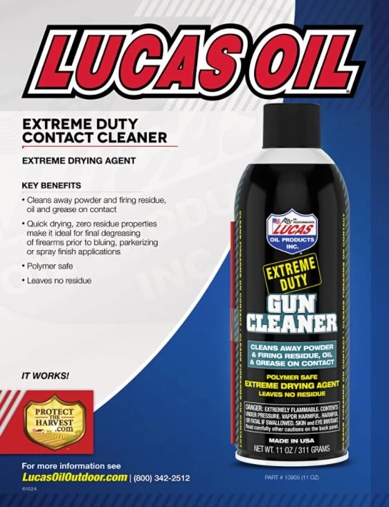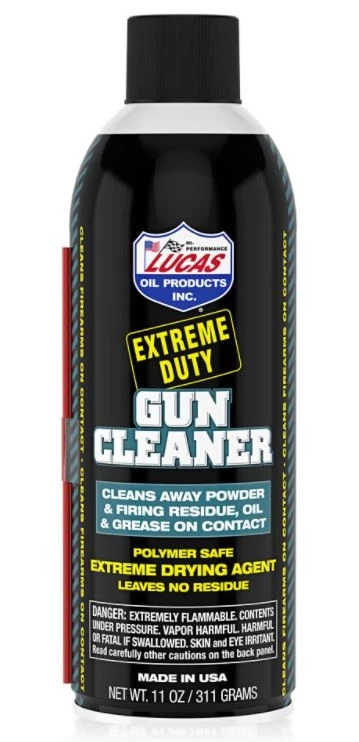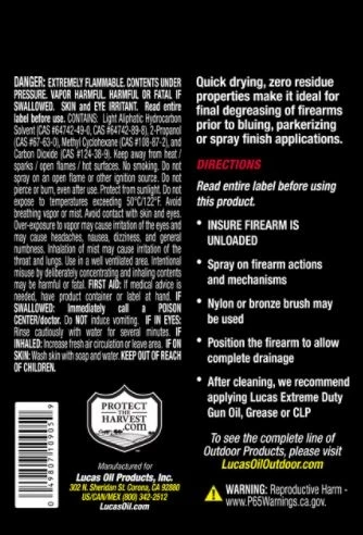 Used and recommended by major firearms manufacturers, Lucas Oil Extreme Duty Gun Cleaner’s consistent high pressure spray contains a unique blend of solvents and cleaning agents designed to blast away powder residue, grease, oil and other debris from firearm actions, slides, barrels and parts. Safe on your firearm’s metal finishes and will not harm polymers subjected to incidental contact. This unique formula displaces water, great for when your firearm is caught out in a rainstorm while hunting. Its quick drying, zero residue properties make it ideal for final degreasing of firearms prior to bluing, parkerizing or spray finish applications. The non-chlorinated, CFC free formula dries quickly and leaves no residue. Read entire label before using this product.