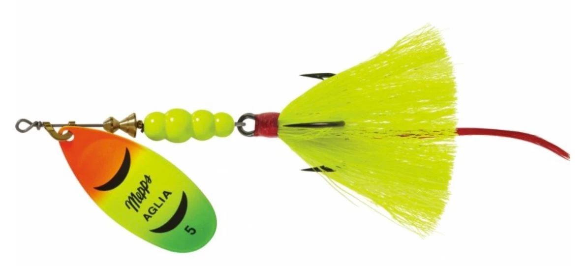 Size #5 Aglias are ideal for large rainbow trout and steelhead, as well as coho (silver) and chinook (king) salmon. Northern pike and giant tackle busting musky will inhale a dressed #5 Mepps spinner.