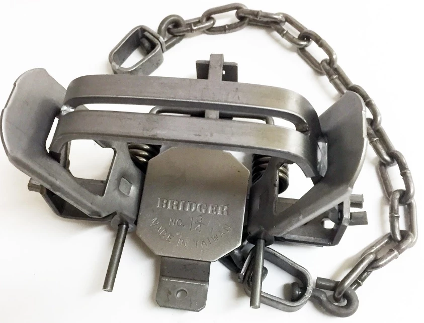 An old favorite with many new upgrades is in stock and ready for immediate shipment. We brought this trap back after giving it a complete facelift. The Bridger #1 3/4 Coilspring Square Jaw comes stock with a night latch dog and double posted pan, heavy swivels, quality straight link machine chain, music wire springs, and an added baseplate with D-Ring. We settled on a size of 4 3/4″ inside jaw spread and 5 1/8″ outside jaw spread to keep it legal in virtually every state. Some trappers will want to outside laminate this trap with 3/16″ rod and with these dimensions it will come in just under the magic 5 1/2″ outside jaw spread that some states require. The measurements of this trap are nearly identical to the MB-550. In field testing in several states this trap proved itself on fox, coyotes, bobcats, and raccoon. This is a tremendous trap for the mixed specie trapper.