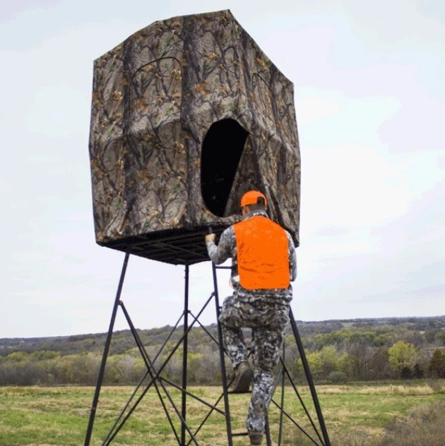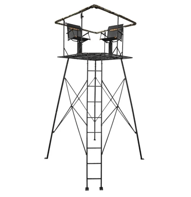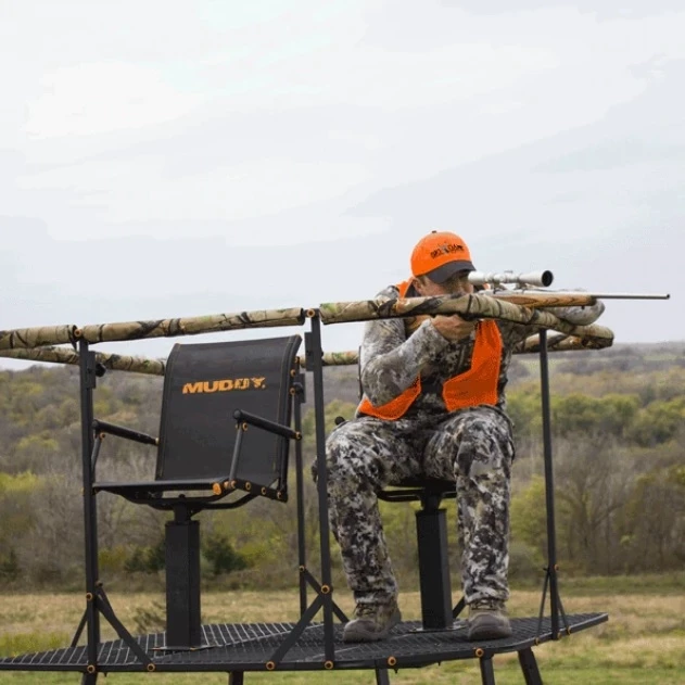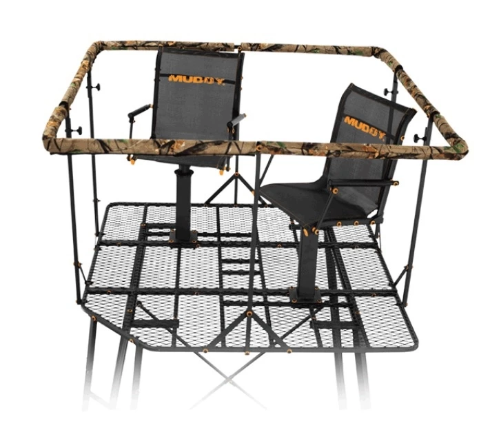 The steel constructed “Quad” quad-pod measures 12’ tall from the ground to the shooting rail and has an exterior 2-rail ladder for easy entry. Padded, full surround 36” high shooting rail, steel floor, and 2 Muddy Flex-tek seats are only a few of the benefits of this quad-pod. The expanded metal platform measures 57″ x 57″. Can be used with or without the camouflage blind, having an 84” standing height. Includes blind securing tie-downs. The “Quad” weighs 158 lbs and holds a weight rating of 500 lbs.