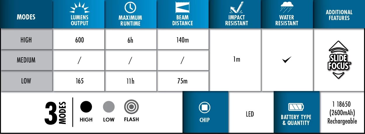 800 LUMENS/210 M BEAM DISTANCE/4H RUNTIME