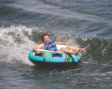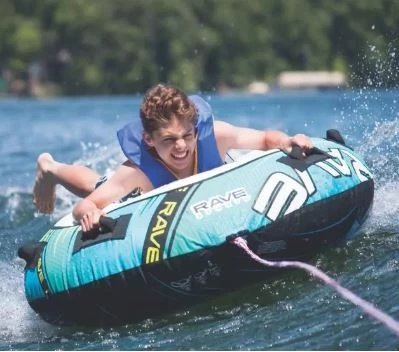 If you’re looking for a tube to please the speed demon in you, then look no further than the RAVE Sports Blade 54″ towable. The Blade’s Skim-fast bottom allows you to slice through the water and plane quickly. Hold on tight to this lightweight donut style tube featuring four handles and a quick connect tow point.