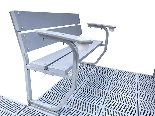 Dock bench has maintenance free Polypropylene deck boards. Arm rest with beverage holder.