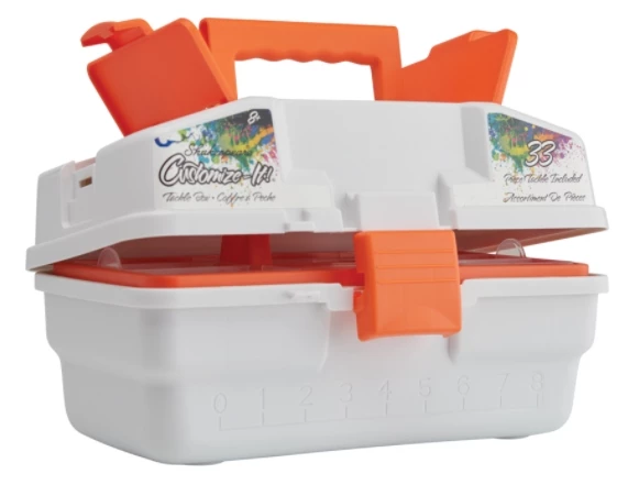 Shakespeare’s® Customize-It® tackle box is designed for today’s fast pace and creative youth anglers. The box includes 29 pieces of assorted fishing tackle, 2 practice casting plugs, a fishing journal and 3 sheets of Customize-It stickers allowing anglers to decorate their tackle box in their very own style. Stickers include shapes, letters and assorted fish species and sizes. The spill-proof tray holds tackle in place when the lid is latched.