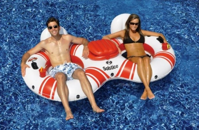 Enjoy all the fun features of an inflatable tube with a friend. The Swimline Solstice Super Chill River Tube Double with Cooler includes two mesh seats with a sturdy back. For extra comfort, this float has two cup holders and a centrally located cooler.