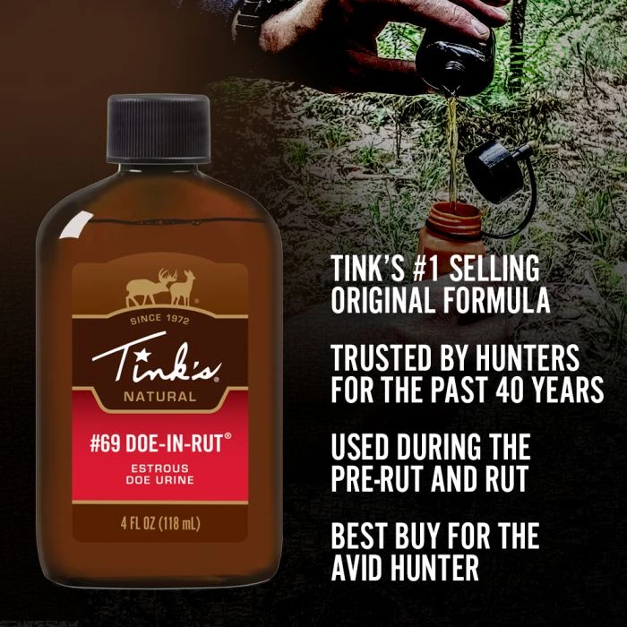 Tink’s® #69 Doe-In-Rut® Buck Lure is 100% natural doe estrous urine collected from live whitetail does during their estrous cycle. Tink’s® quality controlled formula keeps Tink’s® #69 Doe-In-Rut® Buck Lure at the peak level of performance. Tink’s® #69 Doe-In-Rut® Buck Lure, the standard on which all deer lures are measured, produces great results during the pre-rut and rut. Tink’s® #69 Doe-In-Rut® Buck Lure is America’s #1 Buck Lure!