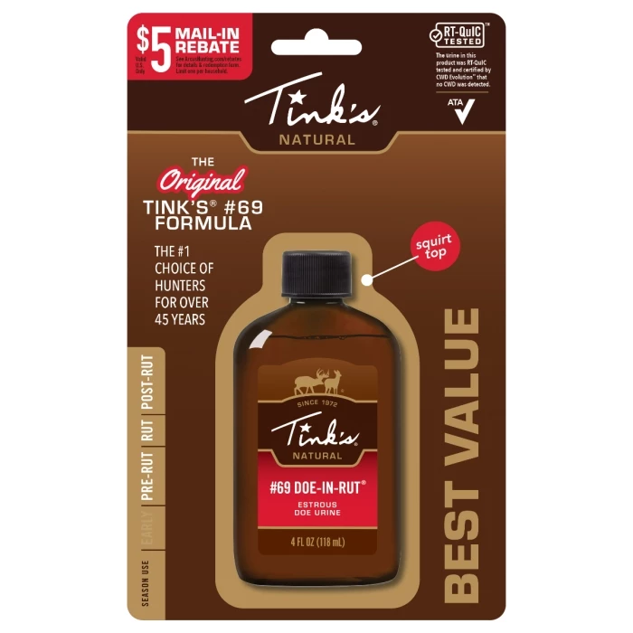 Tink’s® #69 Doe-In-Rut® Buck Lure is 100% natural doe estrous urine collected from live whitetail does during their estrous cycle. Tink’s® quality controlled formula keeps Tink’s® #69 Doe-In-Rut® Buck Lure at the peak level of performance. Tink’s® #69 Doe-In-Rut® Buck Lure, the standard on which all deer lures are measured, produces great results during the pre-rut and rut. Tink’s® #69 Doe-In-Rut® Buck Lure is America’s #1 Buck Lure!
