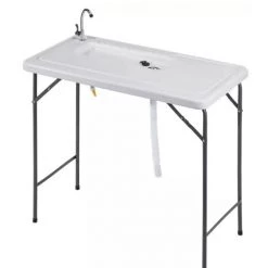 Got fish and game to clean, but no place to do it? With our portable Folding Fillet Table, all you need is a garden hose, a bucket, and a spot to stand. This convenient, very sturdy outdoor accessory sports an extra-large 43″L x 23″W heavy-duty polyethylene processing surface with a 2″D apron; in addition, it stands a full 36-1/2″ off the ground for easy-on-the-back comfort! The integrated 31″ ruler, sloped drainage gutter, and sloped sink basin help make the work more efficient. When you’re finished the entire table folds flat for easy transport or storage (remove faucet assembly prior to folding). Weight: 18.9 lbs.