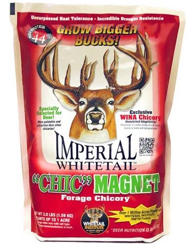 Try Imperial Whitetail “Chic” Magnet, featuring WINA-100 Forage Chicory, which is more tender and less waxy than traditional chicories – and deer are extremely attracted to it. “Chic” Magnet can be planted alone, mixed with other seeds, or over-seeded into existing forages to provide gains in variety, attractiveness and drought-resistance.